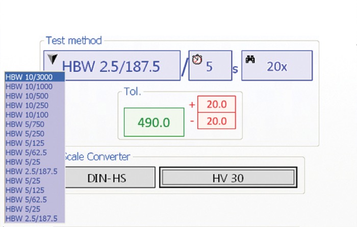 Brinell ISO 6506 / ASTM E-10: HBW1/30 - HBW2.5/15.625 - HBW2.5/31.25 - HBW2.5/62.5 - HBW2.5/187.5 - HBW5/25 - HRW5/62,5 - HBW5/125 - HBW5/250 - HBW5/750 - HBW10/100 - HBW10/250 - HBW10/500 - HBW10/1000 - HBW10/1500 - HBW10/3000
