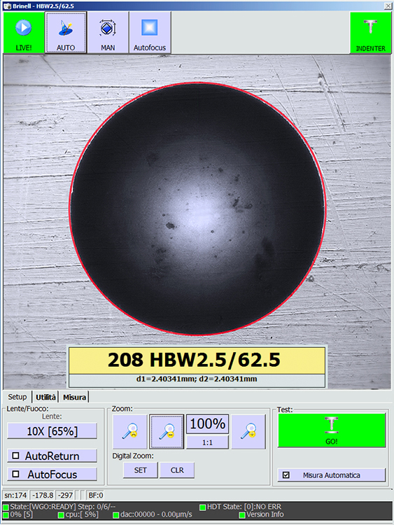 Brinell HBW e HBWT ISO 6506 / ASTM E-10: HBW1/30 - HBW2.5/15.625 - HBW2.5/31.25 - HBW2.5/62.5 - HBW2.5/187.5 - HBW5/25 - HRW5/62,5 - HBW5/125 - HBW5/250 - HBW5/750 - HBW10/100 - HBW10/250 - HBW10/500 - HBW10/1000 - HBW10/1500 - HBW10/3000